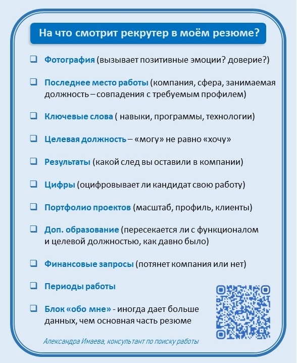Ниже забирайте чек-лист с основными фокусами внимания рекрутера и комментарии по каждому из них.