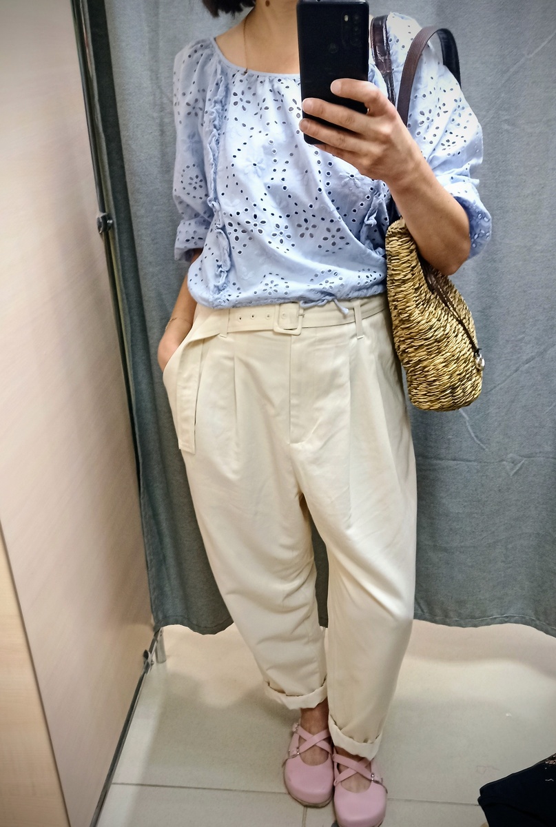 - Первый комплект состоит из вискозных брюк MNG, купленных в пятницу в Вове (в этот день там скидка 50%) за 300 руб. Новые, но все в черных разводах, похожих на мазут. Использовала их в качестве низа для примерки блуз. Понравились тем, что свободно сели. Присмотрелась получше 🕵️♀️ пятна больше похожи на графит от карандаша. Решила рискнуть 300 рублями и купила их