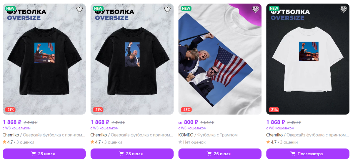 На футболках изображено фото Трампа с поднятой рукой и окровавленным ухом. Продукция представлена как в черном, так и в белом цветах. Самая маленькая стоимость таких футболок на WB на момент выхода статьи - 800 рублей. При этом на "Яндекс Маркете" и Ozon подобных вещей не найдено.