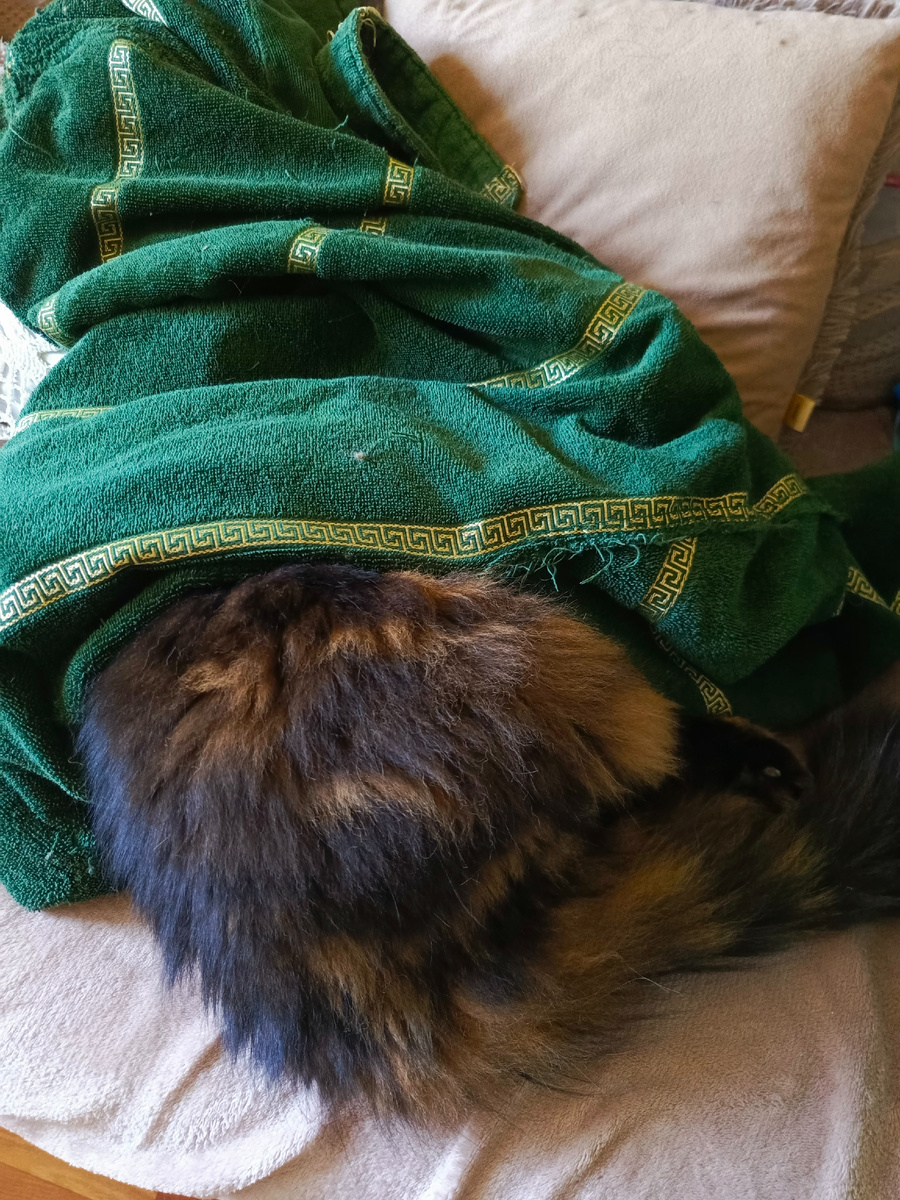Всем привет! С вами Кузя Кусалочкин и сегодня расскажу почему я люблю кушать с ручки и как меня голодом морили. Утром я уже сидел и ждал хозяйку на кухне. Так она точно не отвертится от вкусняшки. И правда, сразу всё поняла, пошла и достала мне вкусняшечку. Я покушал и ушел в комнату. Хозяин ушел на работу. Коробка от его кроссовок почему-то меня не заинтересовала. Через время хозяйка зашла в комнату и была удивлена. А я решил залезть под халат: Хозяйка взяла и раскрыла меня, сказала, что мне там нечем дышать будет. А это моя недовольная мордаха, что меня раскрыли: Ну и я продолжил дальше спать. Перемещался с места на место. Ближе к обеду я учуял, что хозяйка что-то достала в шкафчике и тут же прибежал на кухню. Это оказался паштетик печёночный ( человеческий). Конечно же со мной поделились. И даже покормили с ручки. А знаете, почему мне нравится с ручки кушать? Получается, что не нужно наклоняться и утруждаться. Я могу сидеть и кушать. Это я умывался после еды: После умывани