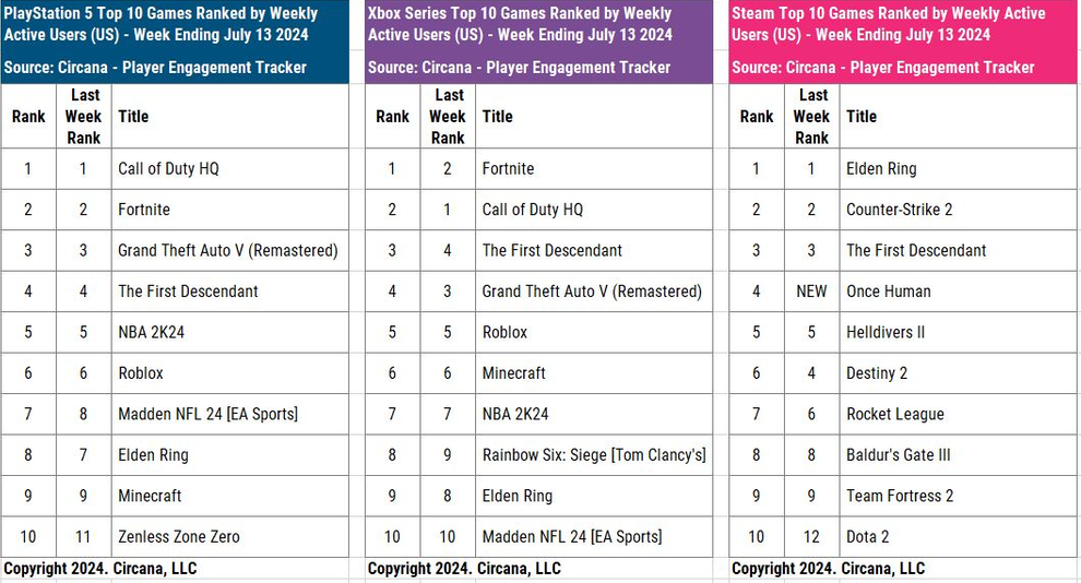 Недавно состоялся релиз Zenless Zone Zero, новой игры от miHoYo (HoYoverse), компании, известной своими проектами Genshin Impact и Honkai Star Rail. Игра стала популярной среди пользователей PlayStation 5, занимая одно из лидирующих мест на платформе Sony. Мат Пискателла, аналитик из Circana, опубликовал топ-10 игр для PlayStation 5. Рейтинг формируется на основе метрики WAU / Weekly Active Users, отражающей количество активных пользователей в течение недели в регионе США. Также отлично показывает себя и шутер-лутер The First Descendant, который не уступает проверенным гигантам рынка игр-сервисов, таким как Call of Duty HQ, Fortnite, GTA 5, Minecraft, Roblox.