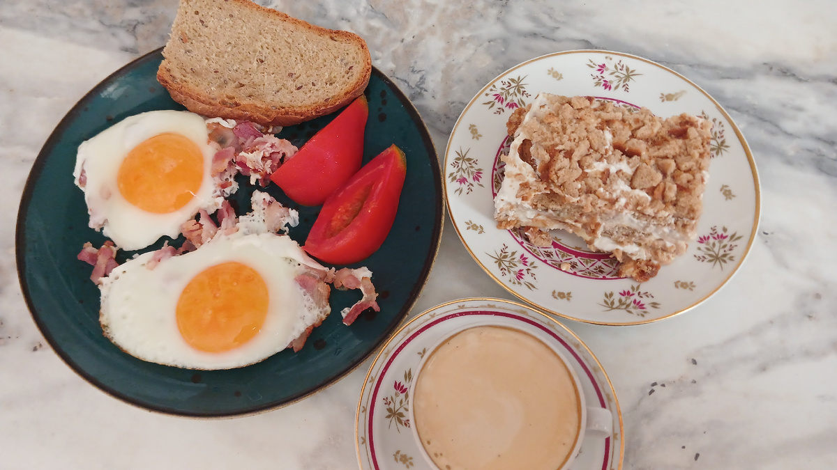 Экономное питание на 226 руб в день Завтракаем, как обычно по воскресеньям, яичницей. Сегодня с беконом и помидорами сделала. И к кофе у нас пряничный тортик. Очень легкий и недорогой десерт без выпечки. 👌 Хлеб домашний на трех видах муки с семенами льна. На обед сварила уху из форели с пшеном. Форель из вкусвилловских рыбных наборов. а потом на десерт нектарин и кофе с пряничным тортиком. На ужин приготовила пасту с грибным жюльеном и салат руккола (домашняя) с огурцами. Дорвалась я до грибов, давно не покупала, а тут набрала в Магните с 25% кешбеком. Рецепты пряничного торта и грибного жюльена есть в каталоге 👌 О моих запасах продуктов и бюджете на питание в июне можно почитать ЗДЕСЬ Каталог рецептов