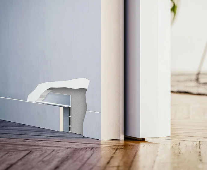 Все варианты скрытых и теневых плинтусов смотрятся современно и презентабельно. Но нужно учитывать нюансы их установки. Скрытые алюминиевые профили ставятся на основание стен (бетон, кирпич, блоки). И только потом производится отделка штукатуркой, гипсокартоном, панелями. Толщина отделки выводится в один уровень с окончанием горизонтальной полочки профиля.