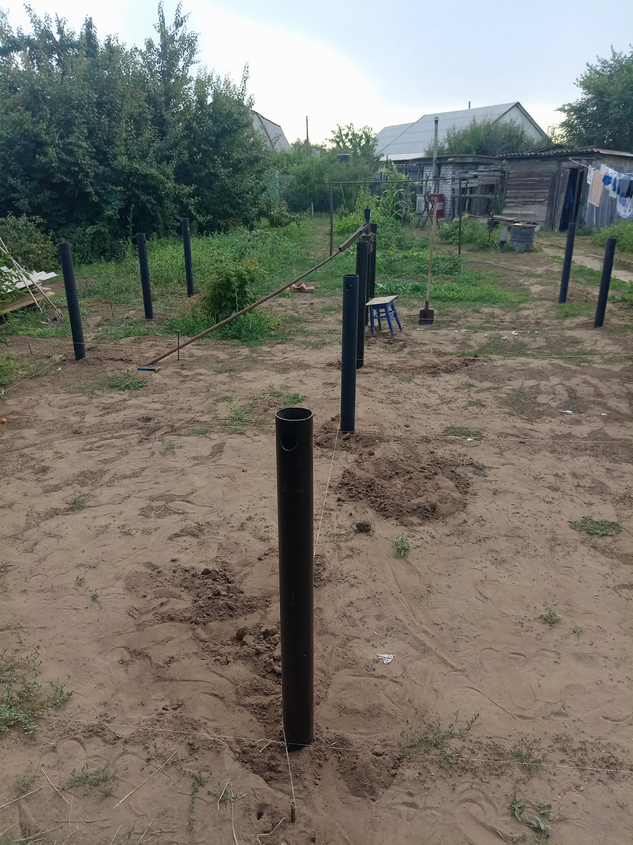 Была сделана разметка по проекту. В проекте было указано 12 свай, но было принято решение увеличить на 3 шт. В ряд 5 свай. Глубина погружения от 120 до 140 см. Выход над грунтом 40 см в самой высокой точкой. Сваи были куплены 108. 3.5-4мм толщина 1.8м длина. Покупал на маркетплейсе цена весной - 2150 руб за шт +оголовок 20х20 - 286 руб за шт (если покупать сразу 10 шт) Крутил самостоятельно. Для установки свай, купил : Гайковерт (мясорубка) Для забуривания сделал: Насадку на сваю для установки гайкаверта и в головку 32 в варил от бура сверло (для установки его в перфоратор) Так же сделал рычаг из проф трубы для упора при забуривания. Дрель была заменена на перфоратор 1200 (дрель даже не повернула) Для установки 15 свай ушло по времени 5 дней по 1 часу работы каждый день (после работы) .