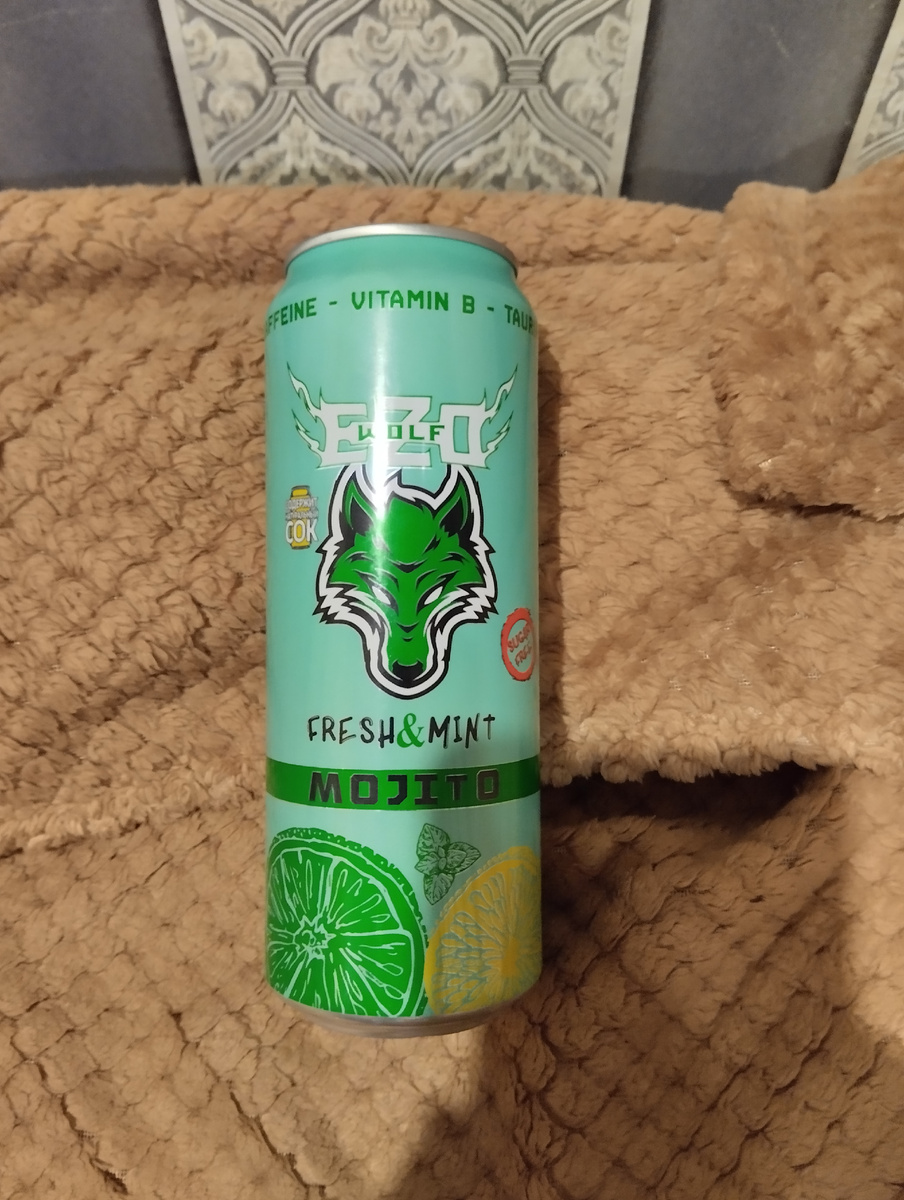 🎬Обзор🎬 🐺Ezo Wolf🐺 🥤Мохито🍹 Вульф со вкусом мохито, который вышел уже с новым дизайном, а не как тропики и ориг. Мохито сложно испортить но можно, но я надеюсь на стандартный мохито похожий на газировку и неплохой (Но и не хороший) по вкусу. Куплен – Familia Цена – 79₽ Объём – 450 мл ☕Кофеин☕ – 29/100 🧬Таурин🧬 – 260/100 Сахар✖️ Подсластители✔️ В плане Цвет=Вкус сделано хорошо, приятный очень светло-зелёный хорошо описывает вкус мохито. Красиво сделанные принты лайма, лимона и мяты, но очень плохо выглядит волк, среди всех рисунков цитрусовых очень выделяется и не вписывается. Лого с одной стороны и интересное, а с другой устаревшее как будто. Хорошо на банке смотрится "Штампик" говорящий что он без сахара и пометка "натуральный сок". Есть некий посыл про Волка Ezo в японской культуре, что даёт свой смысл и интересность. В нём ничего примечательного нет, обычный мохитовый запах с хорошо выделенными мятой и лаймом. Подсластители никак не выделяются. Что ожидалось, то и случило