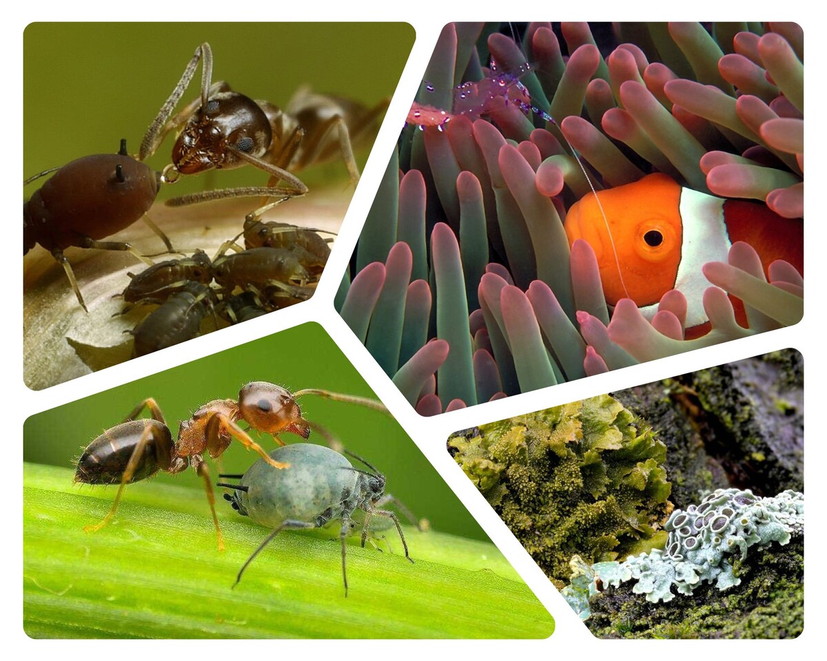 Рыбы-клоуны, или амфиприоны (Amphiprioi ocellaris), живут среди щупалец морских анемонов, которые защищают их от хищников. Взамен рыбы очищают анемоны от паразитов и обеспечивают их пищей, привлекая к анемонам других обитателей, словно наживка. Этот симбиоз делает оба организма более устойчивыми к внешним угрозам. Грибы и водоросли (лишайники)