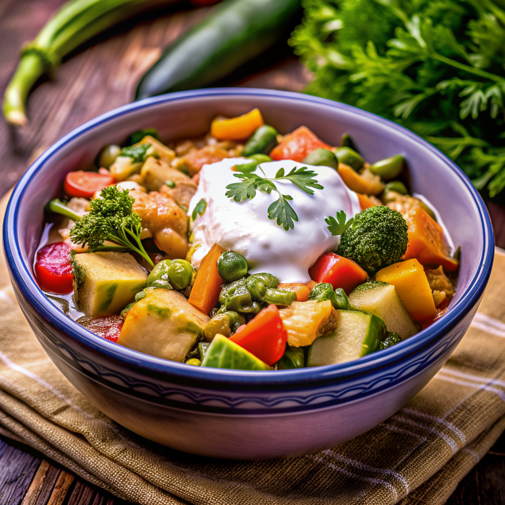 Смешайте сметану с маслом и половиной чайной ложки соли и взбивайте венчиком или вилкой несколько минут, пока смесь не станет однородной. Полученным соусом залейте овощи и не накрывая кастрюлю крышкой поставьте в духовку на 15 минут