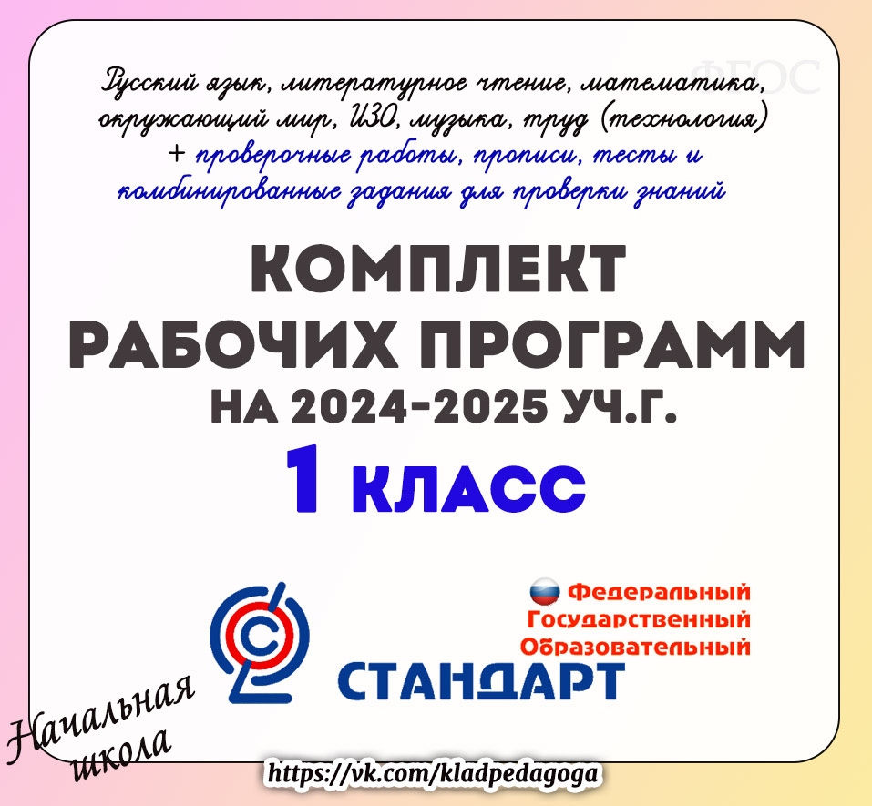 ● + Отличный Бонус! В комплект входят дополнительно: прописи, тесты и рабочие тетради для проверки знаний, тренировочные тесты и комбинированные задания для 1 класса. Приобрести рабочие программы и не только можно в магазине Wildberries "Кладовая педагога" по ссылке: https://digital.wildberries.ru/offer/251526 Также можно посмотреть у нас в сообществе VK Кладовая педагога У нас в сообществе вы найдёте много БЕСПЛАТНОГО материала к урокам и внеклассным мероприятиям. Присоединяйтесь к нашему сообществу VKонтакте Кладовая педагога, чтобы ничего не пропустить! Подписывайтесь на наш канал в Яндекс Дзен, чтобы быть первыми в курсе новинок. Подписывайтесь, мы Вас ждём)))