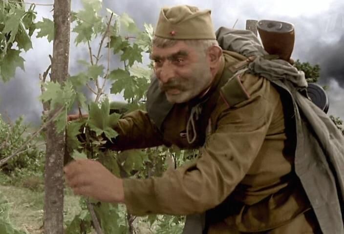 Несколько раз в год пересматриваю советский фильм «Отец солдата». Эпизод, в котором мы видим трогательное отношение главного героя Георгия Махарашвили к винограднику, - один из самых ярких наряду с заключительными сценами фильма. И это неспроста. Ведь здесь мы видим не просто актерскую игру, а неподдельную любовь Серго Александровича к виноградной лозе. Вспомните, как изменились черты Серго Закариадзе (Георгий Махарашвили), когда он увидел виноградник. Суровое, опаленное солнцем лицо героя просияло, и свет заструился по морщинкам. Огрубевшие от тяжелой работы и оружия руки заботливо прикасаются к лозе, поправляют и подвязывают ее. Словно родную матушку повстречал Георгий. Столько нежности и тепла в его взгляде, в движениях рук! И песнь струится из самого сердца, нежного, как лепестки розы. В этот момент ты замираешь и забываешь дышать, наст