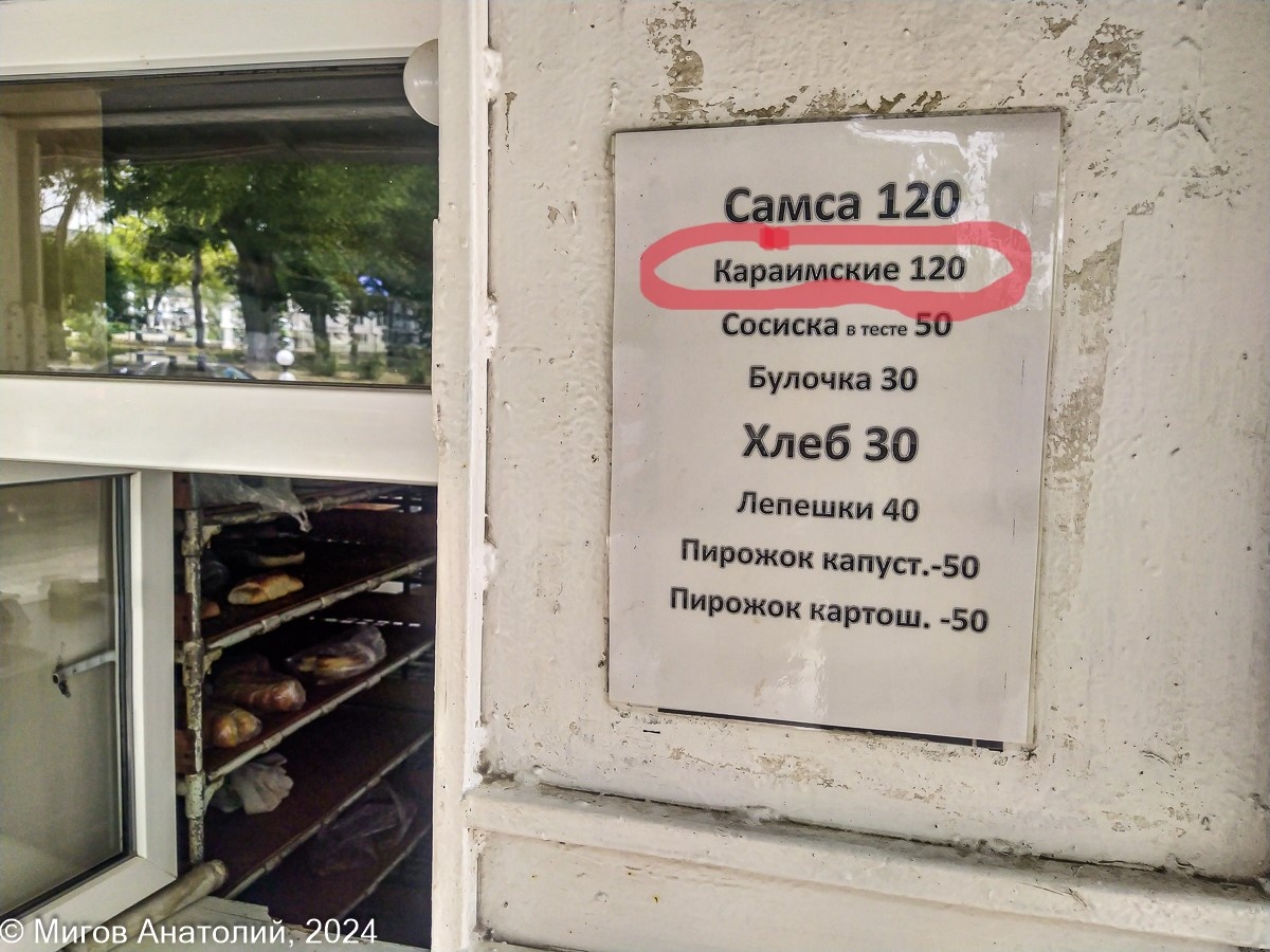 Недавно рассказывал про маленькую пекарню в нашем Старом Крыму, там на ценнике была не всем понятная строчка - "Караимские 120". Ну, про 120, думаю, вопросов нет, ясно, что это цена в рублях. Но вот "Караимские"?... Понятно, что тут же в комментариях пришли вопросы: Что за караимские такие? Лепешки какие-то особые? (Графиня де Монсоро) Уважаемый Анатолий, а "Караимский" из пекарни, это что такое? И живут ли в Старом Крыму Караимы? (Людмила Степанова) Здравствуйте, а какое изделие называют "караимские"? (Елена Б.) Делать нечего, надо отвечать. Специально сходил в эту пекарню за "караимскими" и прочей едой. Надо сказать, что мы здесь время от времени покупаем хлеб, самсу, пирожки и лепёшки ещё с 2016 г., когда мы только переехали в Крым. За это время пекарня совсем не изменилась. И ассортимент тот же, что был 8 лет назад. Цены только растут. Ну тут уж ничего не поделаешь, они нигде не стоят на месте. Так в 2019 г. (ценник на фото ниже) самса и караимский стоили 80 рублей. А в начале