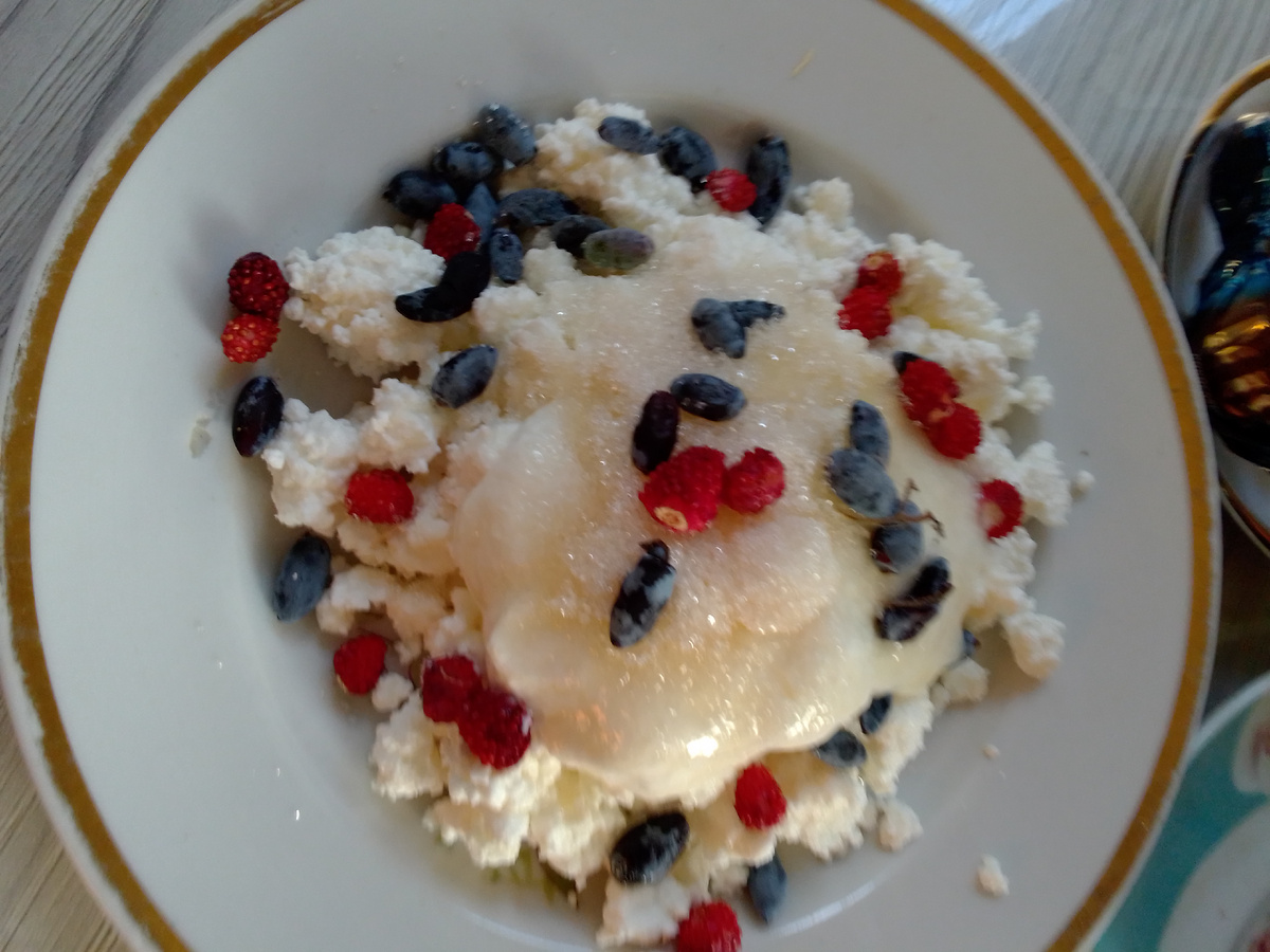Доброе утро всем моим подписчикам и гостям моего канала! С вами Надежда, и я приглашаю вас на мою кухню, где покажу вам наше меню на день. Четверг. Утро обещает, что день будет хороший. На небе ни облачка. Природа ждет дождя. Земля уже вся потрескалась. Собираюсь на работу. Готовлю завтрак. На завтрак у меня сегодня творог с ягодами жимолости и лесной земляники, конечно добавила сметану, сахар и ванильный сахар, а также пила черный кофе с коржиком и шоколадной конфетой Ассорти с кокосовым кремом. Конфеты похожи по вкусу на конфеты Марсианка. Взяла еще на работу разных конфет. Читатель еще выпросил 2 конфеты. 6:20 еду на работу , уже жарко. Жду, когда приедут коллеги, сижу в беседке, вокруг трава выше колен, а репейник уже распустил колючки. Вспомнила, как в детстве из этих шишек делали разные фигурки, а мальчишки ими бросались, часто попадали в голову, мама с большим трудом выдирала их из волос. Как давно это было! А еще мы молодой стебель лопуха ели, было вкусно. Репейник – это не