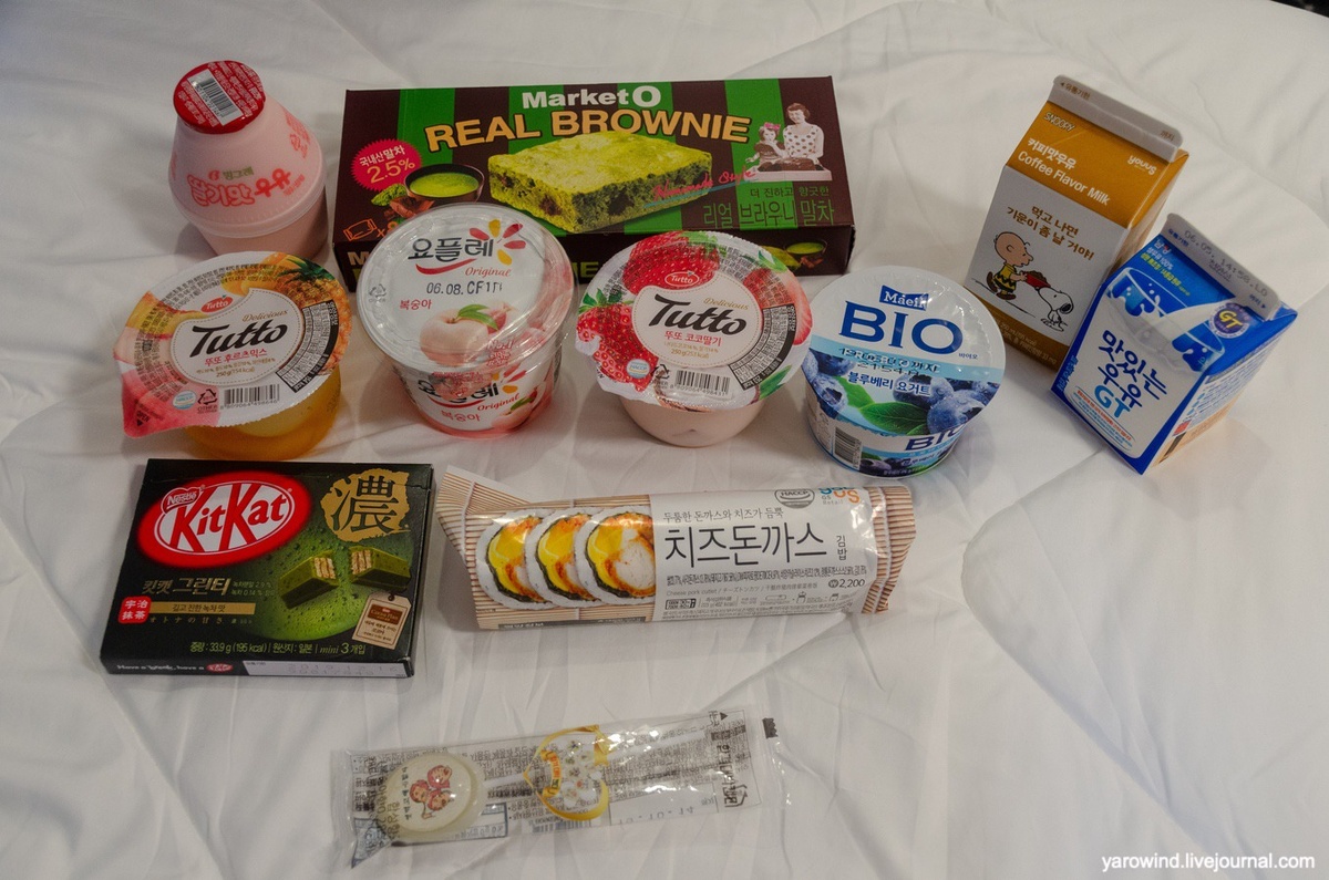 В отелях у нас далеко не везде были завтраки, поэтому мы часто покупали что-нибудь в магазинах. Вот, например – йогурты, желе, молоко со вкусом кофе. Повеселил Настоящий брауни. Правда вот с матчей и зеленого цвета. Но настоящий брауни:). Кексик из Старбакса. В Пусане был и настоящий брауни. Или максимально к нему приближенный. Вот в такой вот пекарне его брал. Еще вариант тортика. Кофе с десертом в уличном кафе. Десерт из сладкой фасоли – в Корее и Китае такое любят. Точка фастфуда на парковке. Мороженки в форме розочек. Орешки сача инчи, они же плоды плукентии вьющейся. По вкусе что-то среднее между арахисом и миндалем. Дынька. Выглядит как большой перезревший огурец. Мы вначале даже удивлялись, зачем их продают. А оказалось, что это дыня и весьма даже сладкая и вкусная!