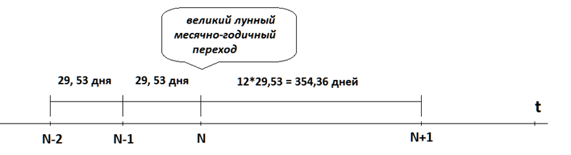Иными словами, в один прекрасный момент времени t временное расстояние между точками на временной оси под номерами N – 1 и N составляет один лунный месяц, т.е. 29,53 дня, а временное расстояние между точками на временной оси под номерами N и N + 1 составляет 12 (двенадцать) лунных месяцев, т.е. один лунный год, или 354,36 дня! Это событие очень хочется назвать великий лунный месячно-годичный переход (ЛМГП). С надеждой на не худшую версию названия.