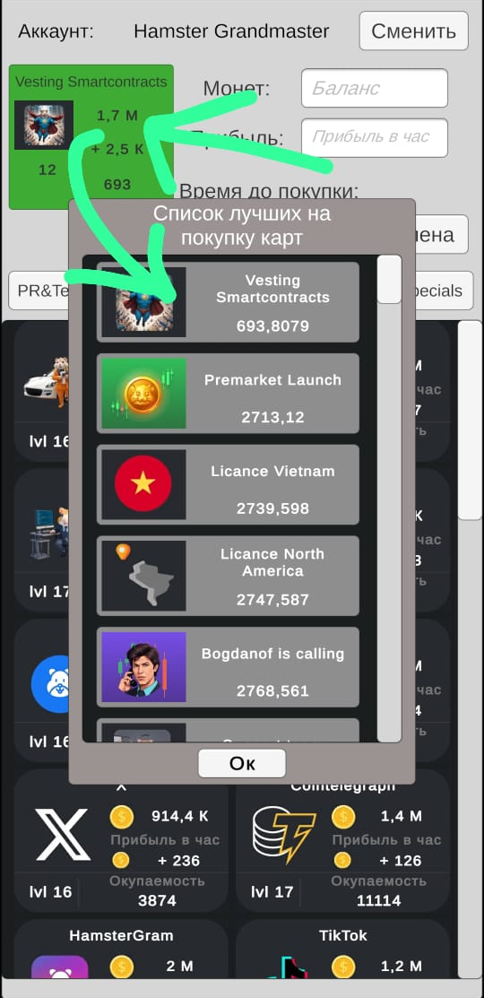 S: • • • Для ввода шифра нажмите кнопку "Ежедневный шифр", далее на красном хомяке вбиваем комбинацию по принципу: Тире - длинное нажатие Точка - обычный тап Для более эффективной прокачки можно использовать калькулятор, интерфейс конечно корявенький, но функциональный. Показывает лучшую для покупки карту (кликнув по ней можно посмотреть весь список), и просчитать время для покупки если не хватает средств сейчас Можно помогать друзьям, сохраняя несколько профилей и переключаться между ними в случае необходимости. Скачивайте калькулятор и качайтесь эффективнее! #hamster_kombat #daily #морзе #код #шифр #crypto #game #TON #HMSTR