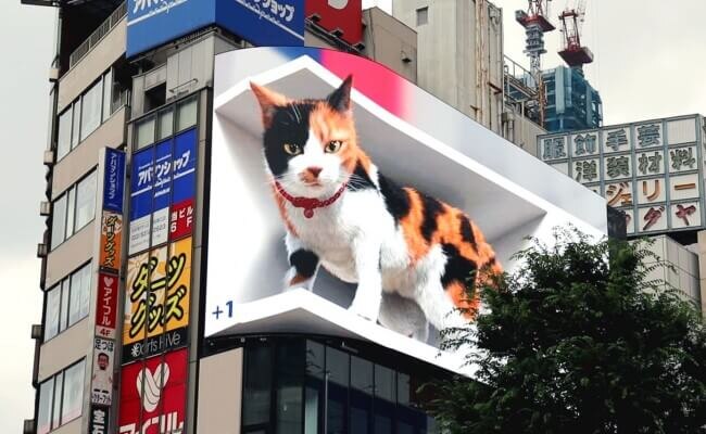 Реклама становится все более захватывающей. Многие бренды размещают на улицах мегаполисов реалистичные 3D-билборды, которые расширяют границы традиционной наружной рекламы и вирусятся в интернете. Объемные баннеры создаются с помощью технологии Naked-Eye: это 3D-проекция на объект, которая учитывает геометрию и местоположение зрителя. Анимация транслируется на технологичных LED-экранах, создающих иллюзию глубины и движения, что делает рекламу динамичной и привлекательной. Предлагаем семь примеров трехмерной рекламы от зарубежных и отечественных брендов. Начнем с классики! В 2021 году на улицах Токио появился билборд с гигантским 3D-котом, который привлёк внимание всего мира – видео и фото с инсталляцией разлетелись по интернету. Котик появлялся на фасаде торгового центра между рекламными роликами, двигался, громко мяукал и вилял хвостом. Изогнутый LEG-экран площадью более 150 квадратных метров, изображение сверхвысокой четкости 4К и качественный звук сделали кота настолько реалистичным