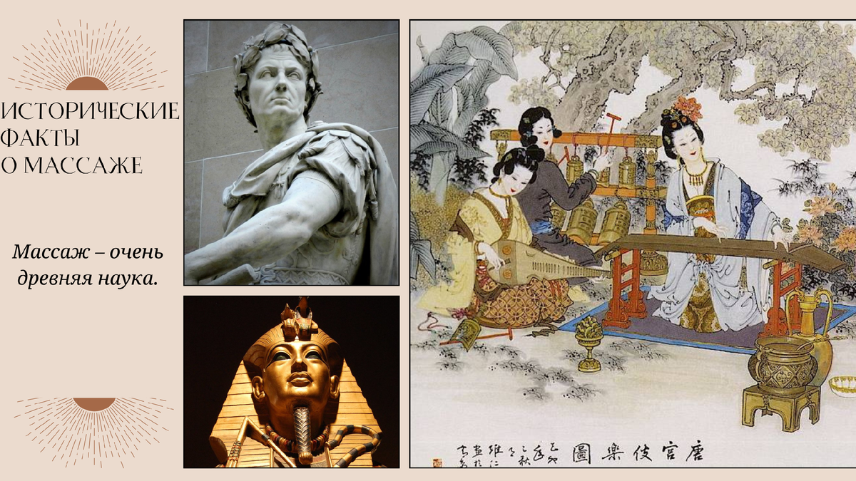 Факт 3. Упоминание точечного массажа и рефлексотерапии можно найти на рисунках гробниц египетских фараонов. Именно на настенных изображениях показаны картины полноценного массажа, которые проводили массажисты Древнего Египта. Факт 4. Массаж имел большую популярность в Древнем Риме. Во 2 веке до нашей эры богатые семьи приглашали массажистов к себе на дом, также массажисты проводили массажи в знаменитых римских термах (банях).
