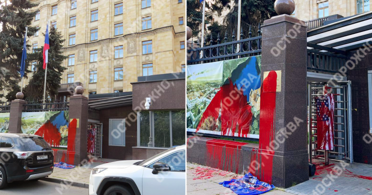 «Стены у входа в посольство Чешской Республики на улице Юлиуса Фучика облили красной краской, а на турникет повесили флаг США, он также измазан краской», — пишет телеграм-канал «Осторожно, Москва», опубликовавший фотографии и видео с улицы Фучика.