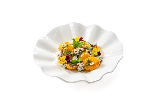 9.Выложить на тарелку абрикосы и сыр. Полить заправкой.