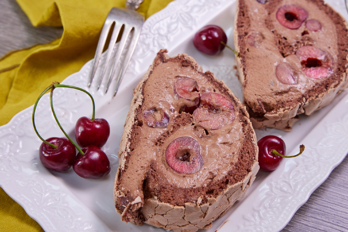 Шоколад горький 2 плитки 180 г Понадобится пергаментная бумага и удалитель косточек из черешни 1. Влить сливки в сотейник и нагреть на медленном огне. Отправить в тёплые сливки кусочки шоколада и перемешивать до полного растворения. Перелить шоколадные сливки в миску, покрыть пищевой плёнкой в контакт и отправить в холодильник до полного остывания, минимум на 2 часа. 2. Разбить 7 яиц и отделить белки от желтков, отправить белки (200 г) в отдельную миску. 3. Добавить в белки щепотку соли и сок 1/6 лимона (пару капель) для стабильности белков при взбивании. Взбить белки до пышной пены. Совет от шефа: «Секрет хорошо взбитых белков - взбивать в сухой миске сухим и чистым венчиками». 4. Сахар смешать с ванильным сахаром до однородности и пересыпать в белки, взбить миксером или венчиком до однородности и плотных стабил
