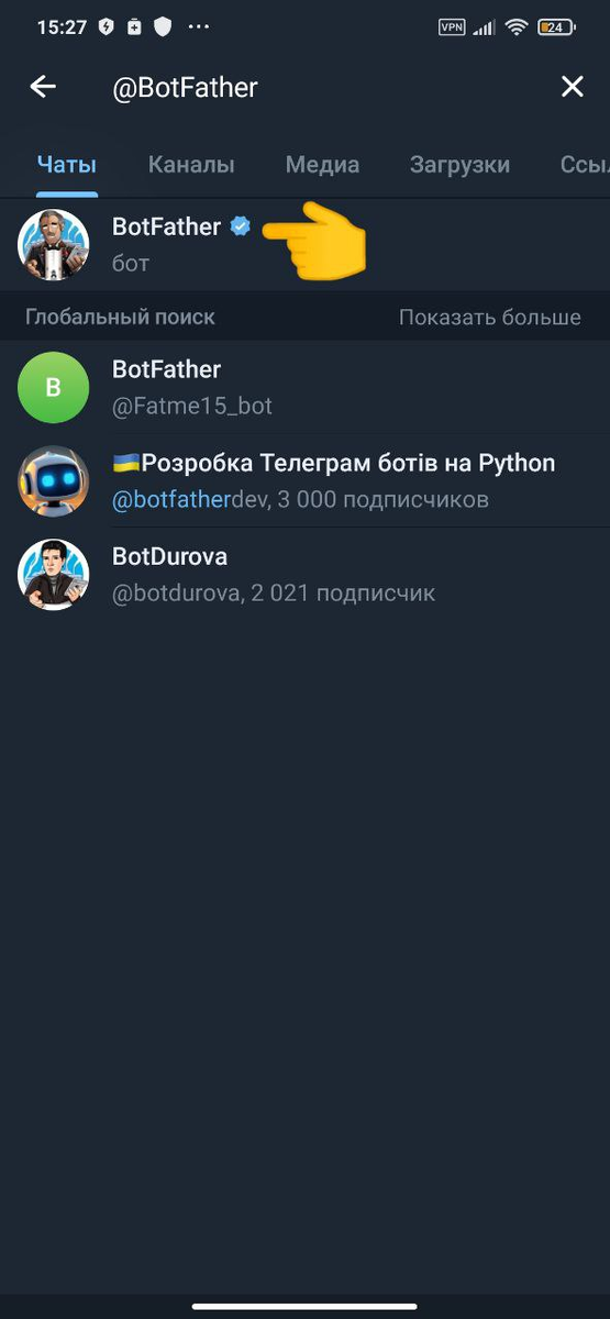 4. Придумываем уникальное имя пользователя для бота, например, "EchoBot_Egor_bot".