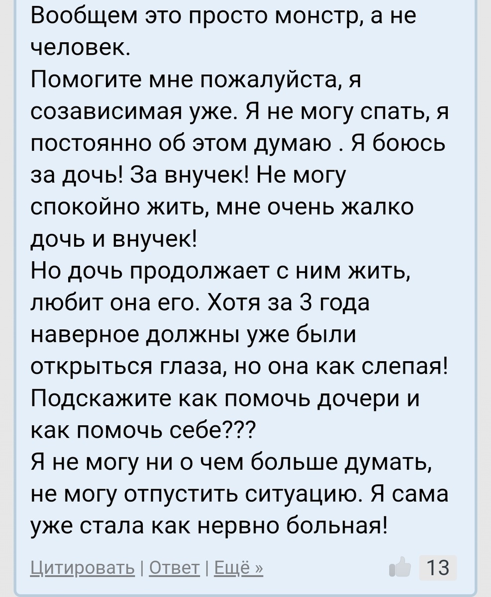 Пишет автор темы на форуме сайта б17. Сайт, на котором вы можете получить бесплатную психологическую помощь. Итак, автор, мать взрослой дочери, у которой есть муж и двое маленьких дочерей от него. Муж не работает, сидит за компьютером играет, ее оскорбляет, бьет. Тещу посылает матом. Ведет себя по-хамски. Автор пишет: Итак, мое мнение такое: Проблема заключается, в том, что это выбор дочери. И как бы она не жалилась родителю, она с ним и соответственно против матери, когда у нее с ним все хорошо. Тоже хамит автору темы (из сабжа автора), обвиняет что мать лезет в ее с мужем отношения, защищает "хорошего" на сейчас мужа. Она замужем. За_мужем. Каким? Ну, какого выбрала сама, за таким и замужем. Я рекомендую к прочтению притчу про собаку на гвозде. Она, и другие не менее интересные публикации, у меня на странице сайта б17 👇👇👇 Так вот, к автору темы у меня по-человечески, огромное сочувствие как к родителю, который чувствует бессилие и отчаянье. Да, пусть и взрослый, но это