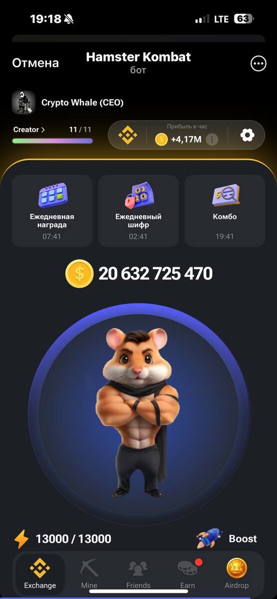 Уверен, многие из вас уже слышали о нашумевшей игре Hamster Combat. Даже сам Павел Дуров не смог остаться равнодушным и упомянул её в своем канале, что уже говорит о многом. Но самое интересное связано с загадочным аккаунтом Crypto Whale, который неизменно занимает первую строчку в рейтингах. Недавно известный блогер "Отец Евген" начал публиковать шокирующие инсайды об игре. Как оказалось, он сумел наладить контакт с главным лидером Hamster Combat, который с радостью делится эксклюзивной информацией. Сначала многим его слова казались небылицами, но со временем предсказания начали сбываться одно за другим, подтверждая их достоверность! По его словам, Hamster Combat готовится стать настоящей сенсацией в игровом мире. Разработчики работают над чем-то настолько грандиозным, что это обещает перевернуть всю индустрию. Те, кто изначально считал проект обманом, теперь могут только сожалеть. Также было бы интересно взглянуть на аккаунт Топ-1 игрока, который уже достиг статуса Creator. "Отец Евг