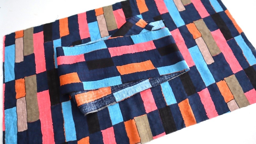 - По стороне 54 см пристрочила полосу, таким образом, чтобы с двух краев свисали одинаковые повязки.