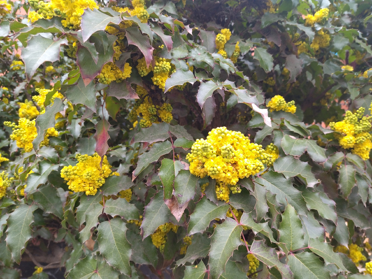 Магония падуболистная (лат. Mahōnia aquifōlium) родич барбарису. Листья у нее – да, напоминают листья падуба. А ягоды похожи на жимолость или мелкий виноград. Цветы напоминают мимозу или желтые ландыши. В общем, магония собрала в себе признаки многих привычных в Евразии растений, при этом сама она родом из Северной Америки.