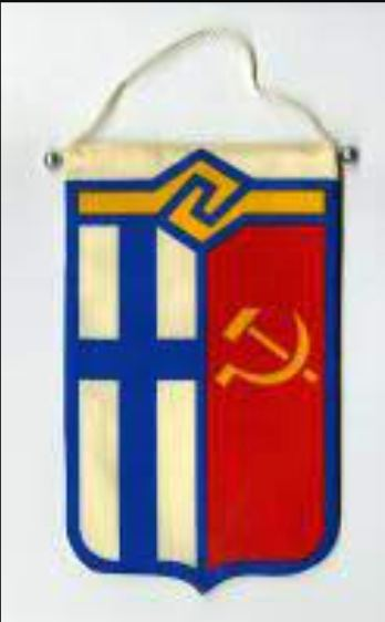 Но вспомним все же ту эпоху, глядя на ее артефакты. Вот вымпел Общества дружбы «СССР – Финляндия» (глядя на руническую форму рукопожатия, невольно думаешь, что old habits die hard, об удивительной истории финской свастики можно почитать здесь).