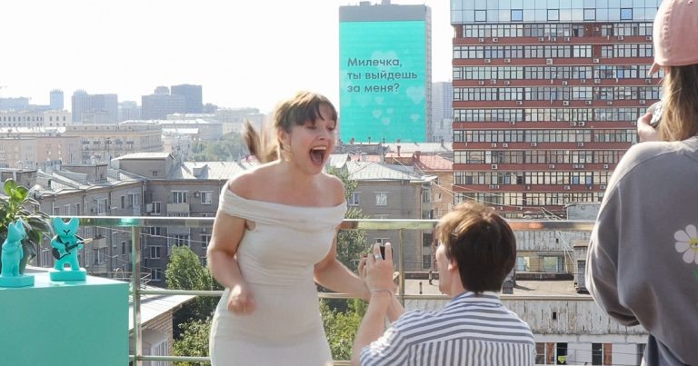 «Ой, это ты только переехал в Москву и меня еще не перевез! Это ты мне “Дайсон” подарил!» — радостно комментировала транслирующиеся на экране их совместные видео Милена, когда ее парень опустился на одно колено и достал кольцо. Она замерла. И тут у нее за спиной на экране появилась надпись: «Милечка, ты выйдешь за меня?»