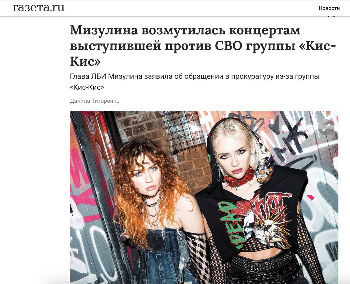 Мизулина опубликовала видеообращение руководителя донецкого объединения «Молодой десант» и пообещала обратиться в Генпрокуратуру: военный заявил, что музыканты в начале СВО призывали аудиторию донатить ВСУ, а после уехали выступать в Европу. А сейчас, по его словам, стало известно, что «кис-кис» даёт концерты в РФ.