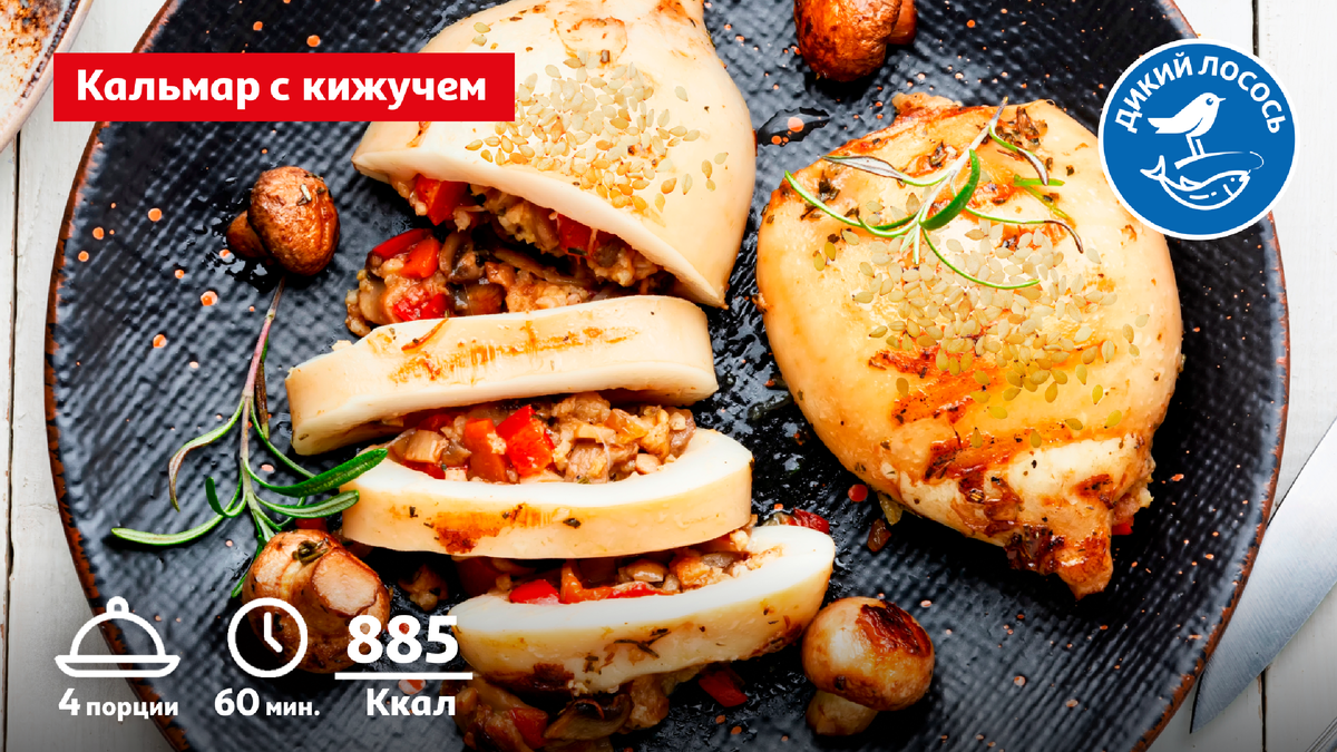 Гастрономический лот этого дня: кальмар, фаршированный кижучем, на гриле. Необычная закуска или самостоятельное блюдо — стоит только добавить гарнир.