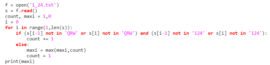 сегодня я поделюсь решением задачи с ЕГЭ по информатике 2024 Текстовый файл состоит из заглавных букв латинского алфавита Q, R, W и цифр 1, 2, 4. Определите в прилагаемом файле максимальное количество идущих подряд символов, среди которых ни одна буква не стоит рядом с буквой, а цифра — с цифрой. Для выполнения этого задания следует написать программу. f = open('1_24.txt')
