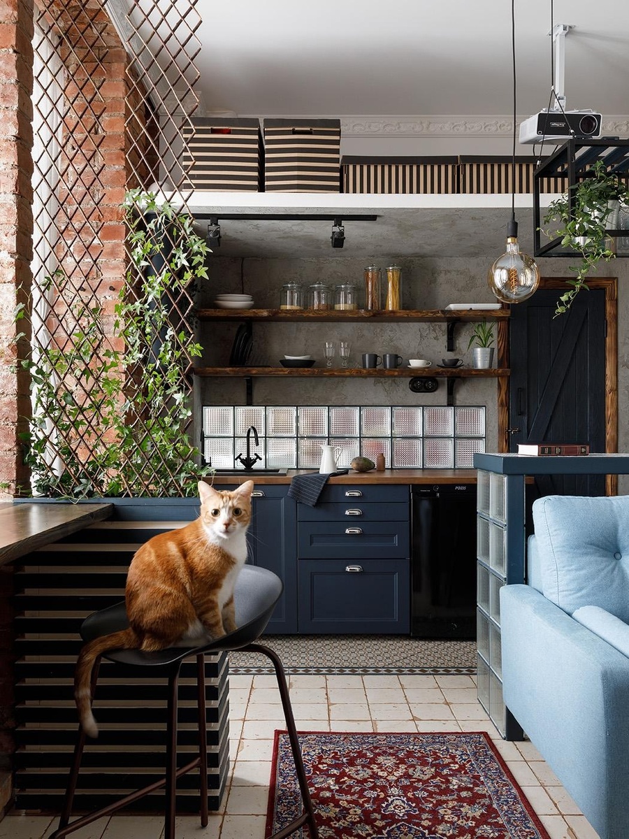 В этой студии смешали очень много интересных приемов: кирпич, стеклоблоки, цемент, антресольный этаж, лепнину, садовые шпалеры, барную стойку… В итоге получился нежное и функциональное пространство в индустриальном стиле для молодой девушки и ее питомца.