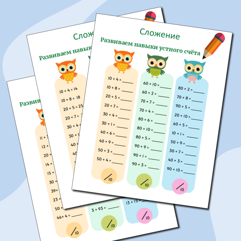 Карточки предназначены для тренировки навыков устного счета и развития математического мышления у детей. Они помогут учащимся быстро и точно выполнять операции сложения в уме. Три карточки, на каждой карточке 3 блока по 10 заданий. Красочный лист, создаст позитивный настрой. Ссылка для скачивания Приятного пользования