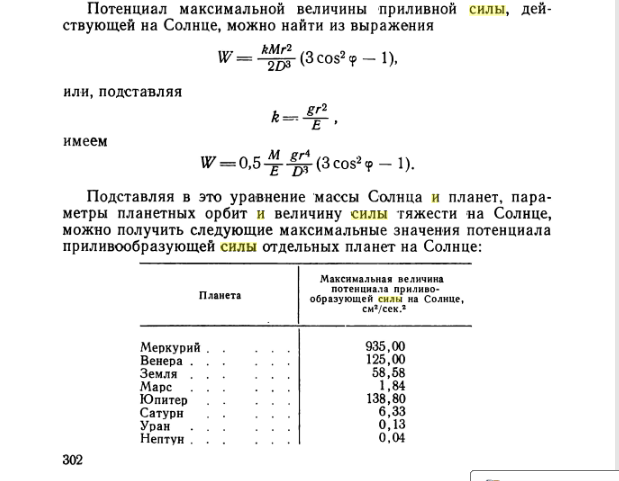 Тогда снова обратимся все к тому же Максимову и его книге «Геофизические процессы и воды океана». В этой книге есть расчет гравитационного потенциала планет по влиянию на Солнце. Вот он: