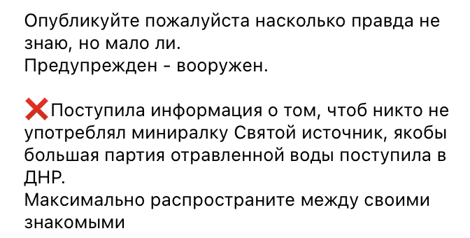 «Не покупайте воду ”Святой Источник”», — аудиосообщения с таким призывом распространяются в российских чатах и мессенджерах. Авторы сообщений утверждают: отравленную воду именно под этой маркой завезли с Украины. В некоторых случаях речь также идет о воде «Серебряный источник». Фейк про отравленную воду «гуляет» по сети уже не первый год. Сейчас вбросы добрались до регионов Сибири. Изначально же информация «родилась» на территории Украины, предостережение якобы было опубликовано от лица бойца ВСУ. Затем фейк перекочевал в новые российские регионы и начал вируситься в ДНР. Сразу же в сети появилось опровержение от лица местного волонтера. Отметим, что производство воды «Святой источник» полностью сосредоточено на территории России — в Московской области, Липецке, Костроме, Новосибирске. То же самое можно сказать и о воде «Серебряный источник», которую разливают на Сахалине. Очевидно, что цель подобных сообщений — посеять панику среди населения. Добавим, что фейки о других отравленных пр