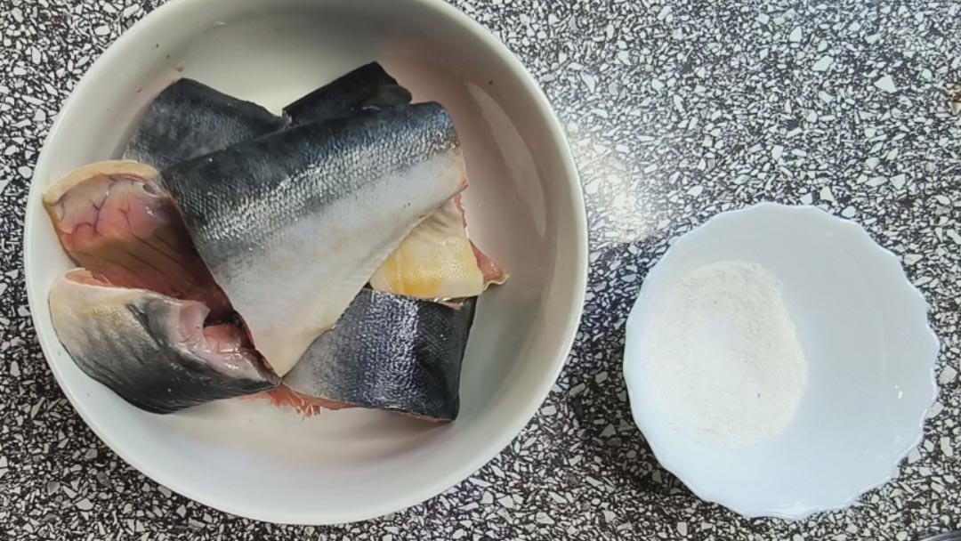 Для этого блюда подойдёт любая рыба. Обычно я покупаю горбушу, но сегодня решила попробовать рыбку, которая в магазине была обозначена как "дикий лосось". Муж предположил, что это голец, мне эта рыбка понравилась даже больше, чем горбуша, всё-таки горбуша чуток горчит, на мой вкус. Пропорции соли и сахара будут рассчитаны на рыбу весом 1,2 кг с головой (голову мы не используем). Рыбу почистить, промыть под проточной водой. Разрезать на кусочки шириной примерно 8 см. У меня получилось 5 кусочков. 1 ст. л. соли, смешать с 1 ч. л. сахара. Этой смесью посыпать каждый кусочек внутри и снаружи. Сложить все кусочки вместе и завернуть в двойной слой пищевой плёнки, я обычно заворачиваю в один слой, как бы фиксирую их вместе, а потом ещё в один слой. Оставляем рыбу на 12-16 часов в холодильнике, чтобы она просолилась. Лучше не передерживать, так как рыба может стать излишне солёной. Спустя положенное время рыбу достаём, промываем под проточной водой и обсушиваем бумажными полотенцами. Заворач
