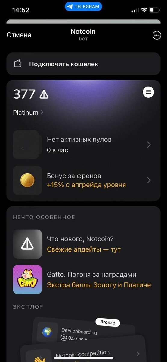 Думаю, не стоит объяснять, что такое Notcoin, потому что все и так знают отца всех тапалок. Многим удалось неплохо заработать на проекте без вложений, и сейчас снова появилась такая возможность! Если хочешь быть в курсе всех криптоновостей подписывайся на мой телеграм канал. Там выкладываю комбо к криптоиграм и публикую все актуальные новости по крипто приложениям. 🔸 Новая реферальная система. Все старые рефералы были сброшены и теперь заново можно приглашать новых друзей в Notcoin. Каждый приглашенный френ получит 7 дней платинового статуса бесплатно. 🔸 Я повысил статус до Platinum за счет застейканных $NOT. Думаю, скоро количество заданий на заработок $NOT заметно увеличат, чтобы вызвать FOMO и толпа побежит покупать себе новые уровни доступа. И этой первой волне должно повести, ведь впереди альтсезон. Чем раньше зайдешь, тем больше шанс заработать ❗️Заходи сейчас и получи 7 дней платинового статуса бесплатно Ссылка на игру: https://t.me/notcoin_bot Ставь 🔥 и заходи в другие проек