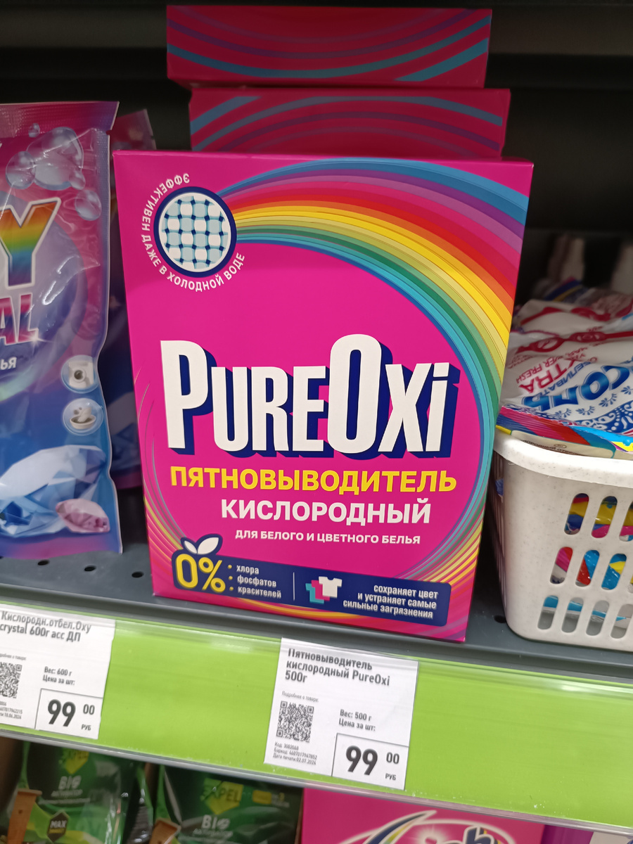 Еще один кислородный отбеливатель для белого и цветного. Кстати, по такой же цене! НО - 600 гр. То есть, дешевле даже, чем выше коробка.