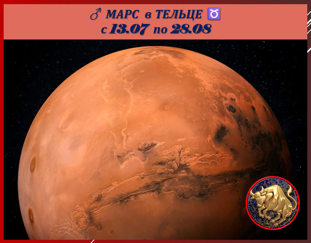 Итак, Марс перешёл во враждебный знак Телец ♉, где пробудет с 13.07 по 28.08.