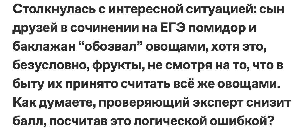 Значит, помидор — это овощ? Да, но только когда мы покупаем его в магазине, убираем в холодильник или режем в салат. Для ботаника на его профессиональном языке помидор — это фрукт. А огурец? С точки зрения ботаники тоже фрукт. С арбузом, как можно догадаться, тоже все непросто: этот плод называется… тыквиной, причем тыквины по своему строению мало чем отличаются от ягод. Но в наивной картине мира арбуз в лучшем случае бахчевая культура, а то и просто нечто зеленое, шарообразное, тяжелое и сладкое.