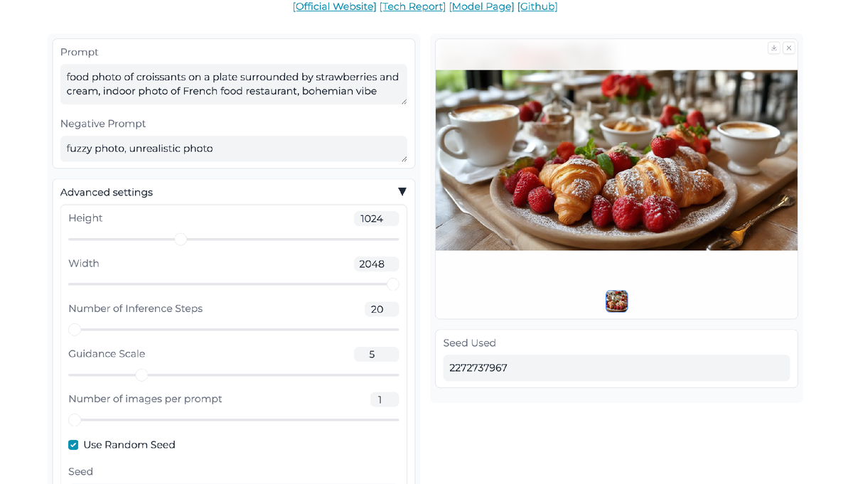 Kolors — открытый генератор изображений, доступен бесплатно, но для коммерческого использования необходимо получить разрешение разработчиков. Я потестила, качество достойное. Саму нейросеть можно скачать с Github или попробовать на сайте Huggingface. Сложнее всего генераторам изображений даются реалистичные фото, и можно сразу определить, годная перед нами нейросеть или нет. Поэтому не будем тратить время, и сразу сгенерируем продуктовые фото. Я использовала довольно сложный промт "food photo of croissants on a plate surrounded by strawberries and cream, indoor photo of French food restaurant, bohemian vibe" Как и в Midjourney, можно указать негативные слова, я указала: "fuzzy photo, unrealistic photo", чтобы получить реалистичное продуктовое фото: Размер тоже, как и в Midjourney, настраивается. Еще тут так же как и в Midjourney за изображением закрепляется seed - число, которое можно указывать для получения результата в таком же стиле. Я скопировала этот seed и использовала уже другой