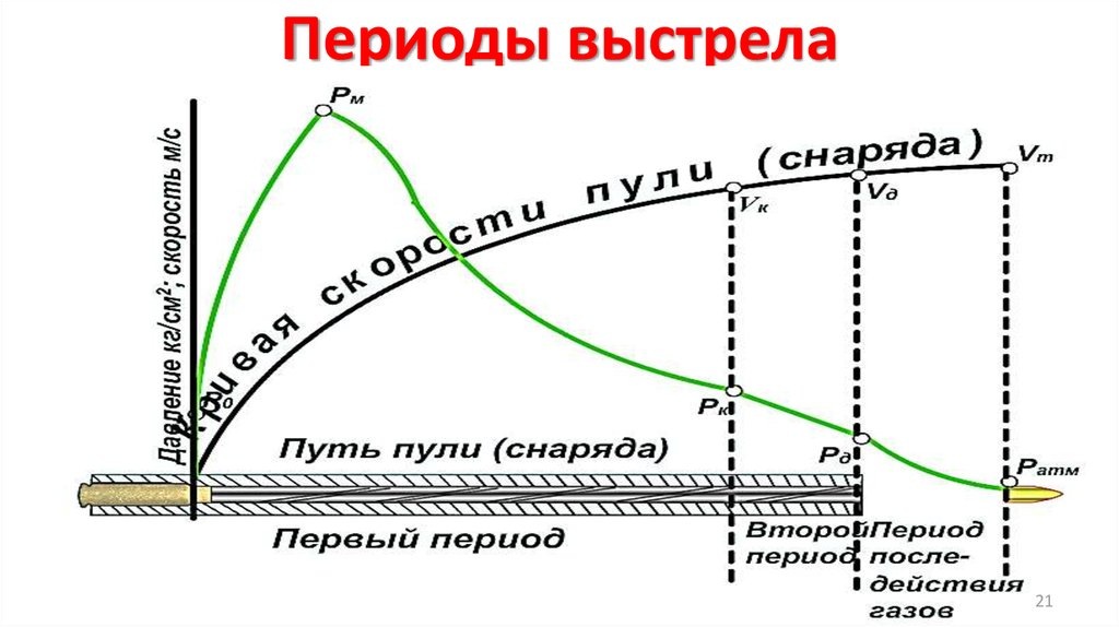 Первый, или основной период длится от начала движения пули до момента полного сгорания порохового заряда. В этот период горение порохового заряда происходит в быстро изменяющемся объеме. В начале периода, когда скорость движения пули по каналу ствола еще невелика, количество газов растет быстрее, чем объем запульного пространства (пространство между дном пули и дном гильзы), давление газов быстро повышается и достигает наибольшей величины (например, у стрелкового оружия под патрон образца 1943 г. - 2800 кг/см2, а под винтовочный патрон - 2900 кг/см2). Это давление называется максимальным давлением. Оно создается у стрелкового оружия при прохождении пулей 4-6 см пути. Затем, вследствие быстрого увеличения скорости движения пули, объем запульного пространства увеличивается быстрее притока новых газов, и давление начинает падать, к концу периода оно равно примерно 2/3 максимального давления. Скорость движения пули постоянно возрастает и к концу периода достигает примерно 3/4 начальной скорости. Пороховой заряд полностью сгорает незадолго до того, как пуля вылетит из канала ствола.