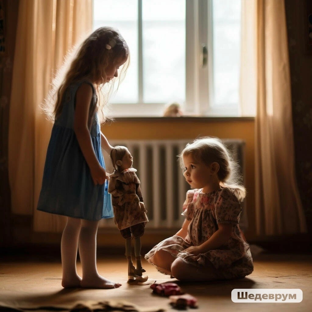 — С девочкой! Представляешь у нее нет кукол! Давай ей подарим? Ой, а она уже ушла! Но ничего, завтра придет, она обещала!