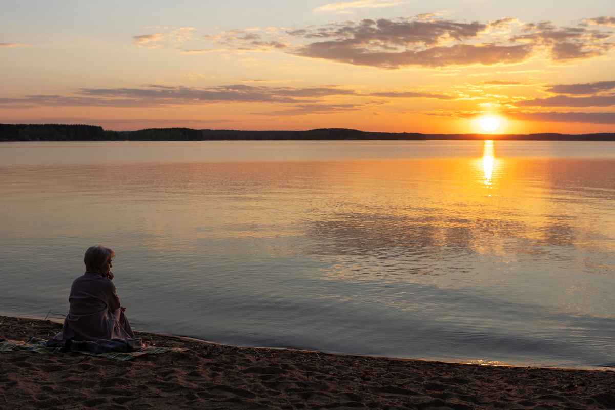 На речном пляже уже мало народа. На лавочке сидят Наташа и Диана. Наташа ест мороженое, Диана залипает в телефоне. На берегу стоит Елена с мужскими вещами и полотенцем. Она вглядывается в реку, будто кого-то высматривает.