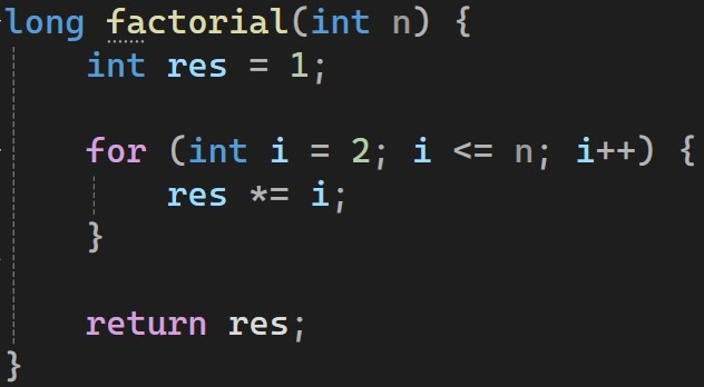 Что такое факториал? Факториал - это произведение всех натуральных числе от 1 до числа факториала. Например, факториал пяти - 5! = 1 * 2 * 3 * 4 * 5 = 120 1. Объявляем функцию, которая возвращает long и принимает параметр n в виде целого числа int или long. 2. Объявляем переменную res и присваиваем ей значение 1. 3. В цикле for делаем перебор от 2 до параметра n. 4. Умножаем наш res на переменную i из цикла. 5. Возращаем res. Так как наш цикл - это 2, 3, 4, ... , n, то 1 умножается на каждое это число и получается факториал!