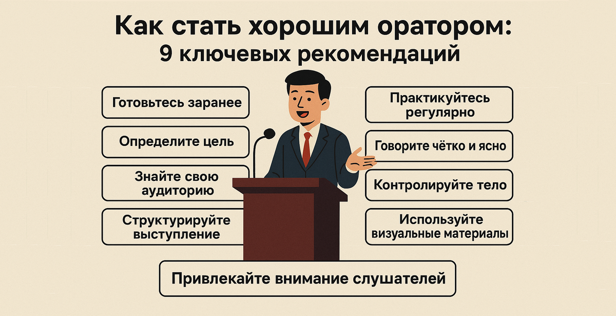 В статье 9 советов, которые помогут человеку стать хорошим оратором. Статья для тех, у кого совсем нет опыта публичных выступлений. На первый взгляд может показаться, что публичные выступления — это удел политиков. Но на практике навыки публичных выступлений могут потребоваться куда большему количеству людей. Например, вам нужно провести презентацию, это тоже публичное выступление. Или вас отправили на конференцию и вам нужно представить свою компанию на ней. Так что можно сделать, чтобы стать хорошим оратором. Откровенно говоря, хороший оратор может и не быть отличным знатоком темы, на которую он выступает. Но если вы только начинаете, то лучше вам отлично разбираться в своей теме. Перед кем именно вы будете выступать? Перед коллегами? Или перед сторонней публикой, которая вообще не разбирается в вашей теме? Знание своей аудитории поможет вам использовать те слова, которые точно будут поняты вашими зрителями. Не нужно полностью заучивать свою речь, и избегайте чтения с бумаги (или с п