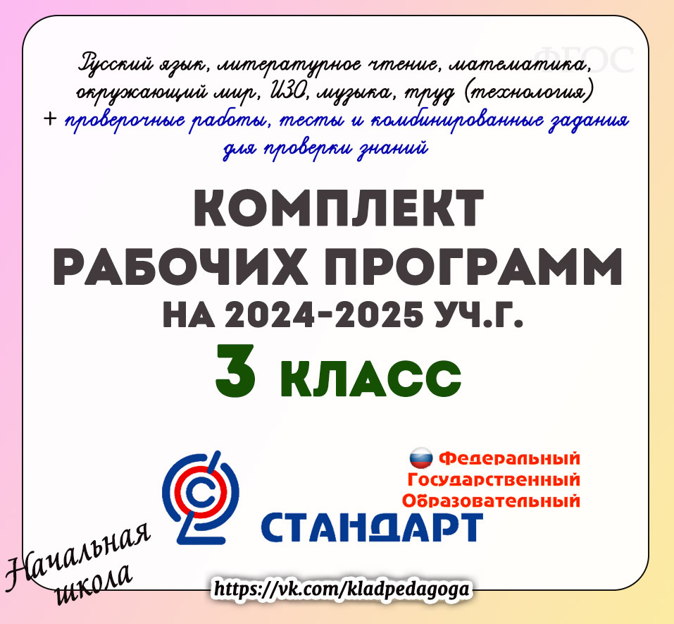 ● + Отличный Бонус! В комплект входят дополнительно: проверочные работы, тесты и комбинированные задания для проверки знаний для 3 класса. Приобрести рабочие программы и не только можно в магазине Wildberries "Кладовая педагога" по ссылке: https://digital.wildberries.ru/offer/252194 Также можно посмотреть у нас в сообществе VK Кладовая педагога У нас в сообществе вы найдёте много БЕСПЛАТНОГО материала к урокам и внеклассным мероприятиям. Присоединяйтесь к нашему сообществу VKонтакте Кладовая педагога, чтобы ничего не пропустить! Подписывайтесь на наш канал в Яндекс Дзен, чтобы быть первыми в курсе новинок. Подписывайтесь, мы Вас ждём)))