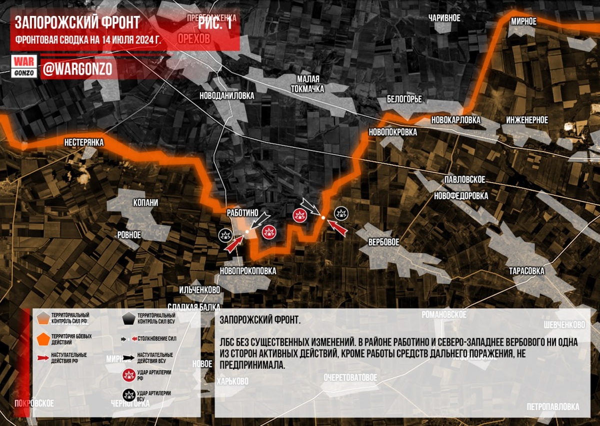 Запорожский фронт. ЛБС без существенных изменений. В районе Работино и северо-западнее Вербового ни одна из сторон активных действий, кроме работы средств дальнего поражения, не предпринимала. (Рис. 1)